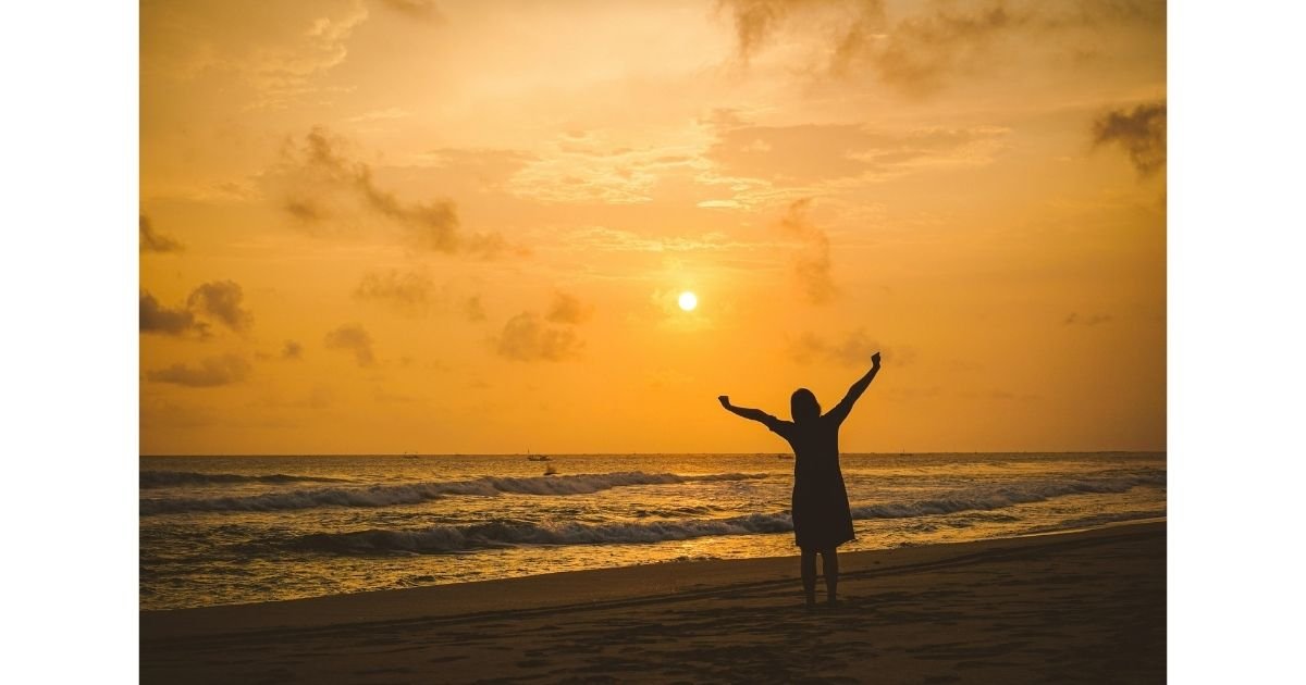 A silhouette of a woman standing on the beach at sunset with her arms raised, symbolizing gratitude and a Christ-centered life.
